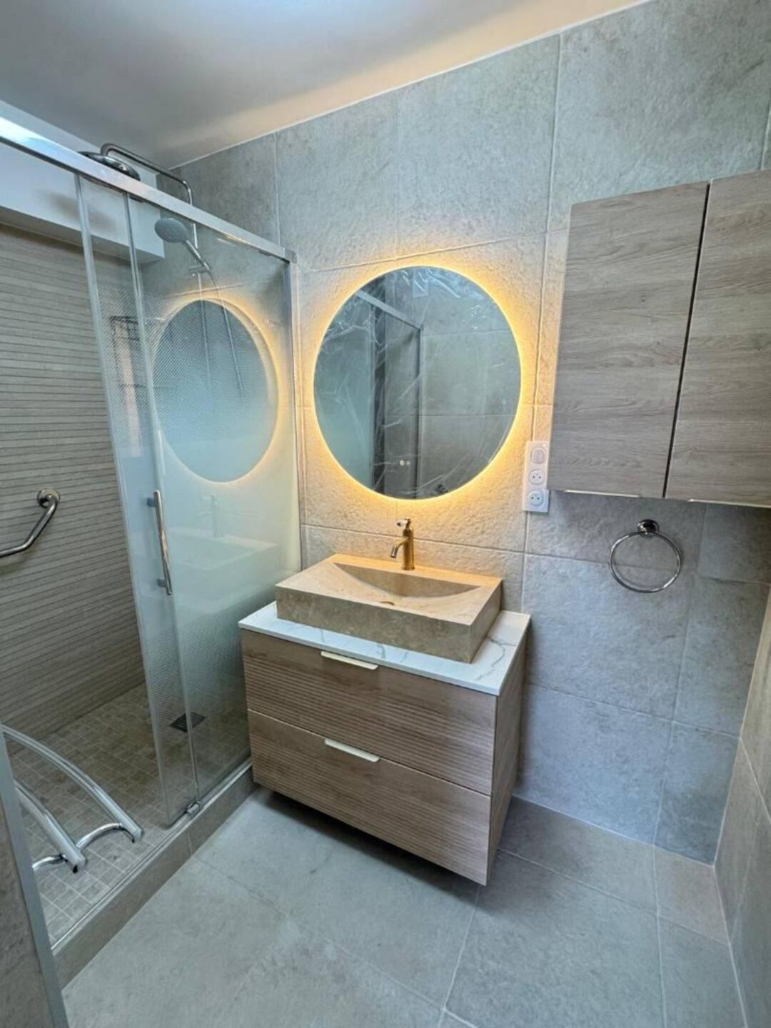 L’électricité a été entièrement reprise et mise aux normes, incluant la création de nouveaux points lumineux, la sécurisation des circuits et l’optimisation des prises pour répondre aux besoins actuels. La salle de bain a été rénovée de manière complète : remplacement des sanitaires, nouveau carrelage, mise en place d’une douche moderne et finitions contemporaines pour un espace plus confortable et fonctionnel.