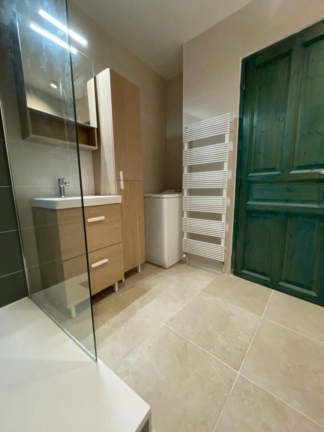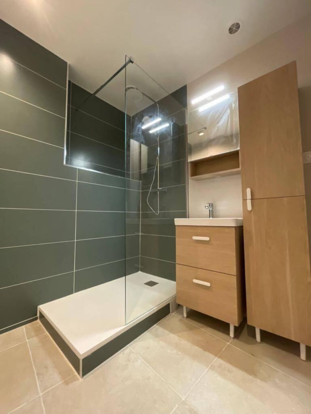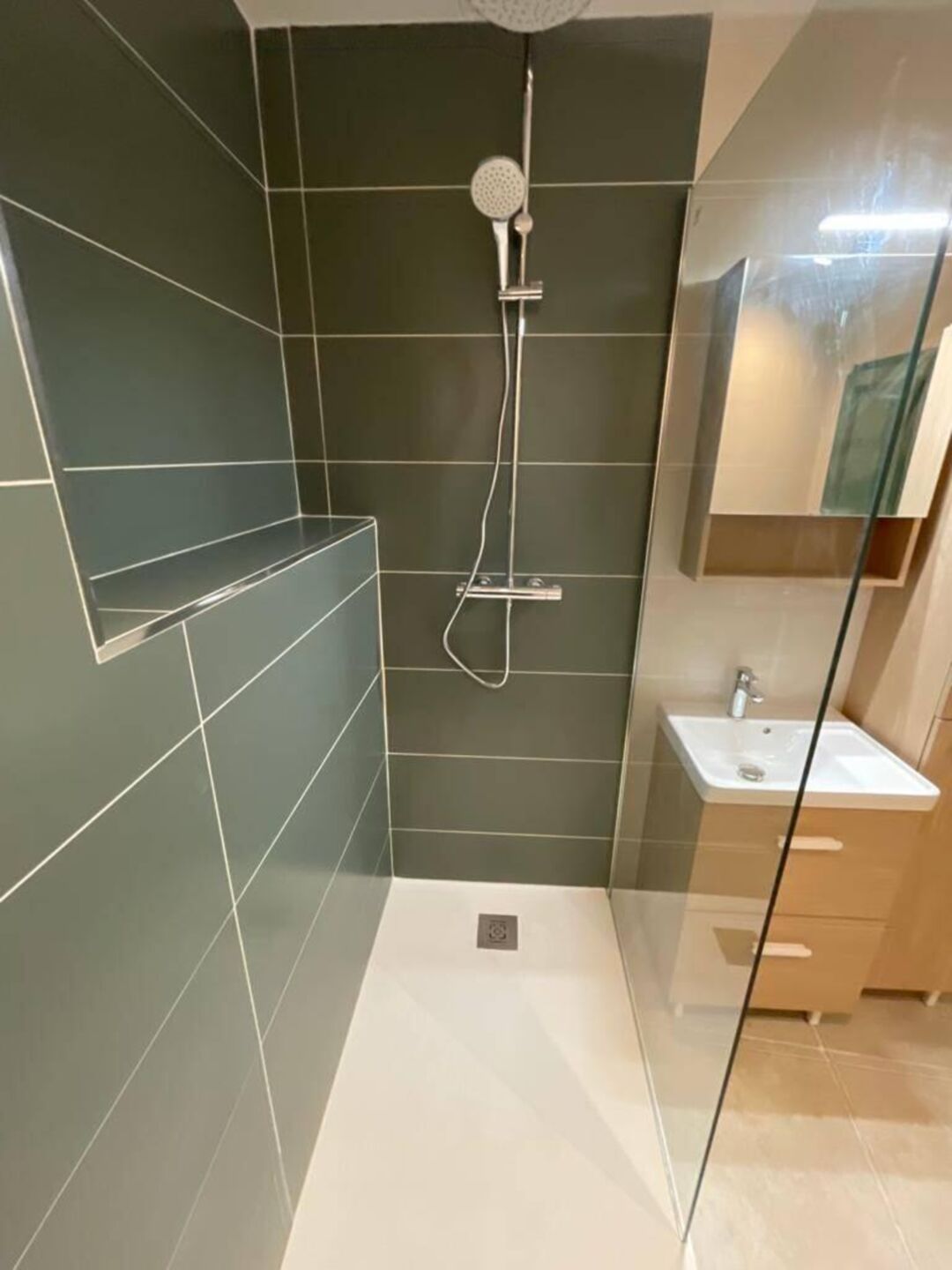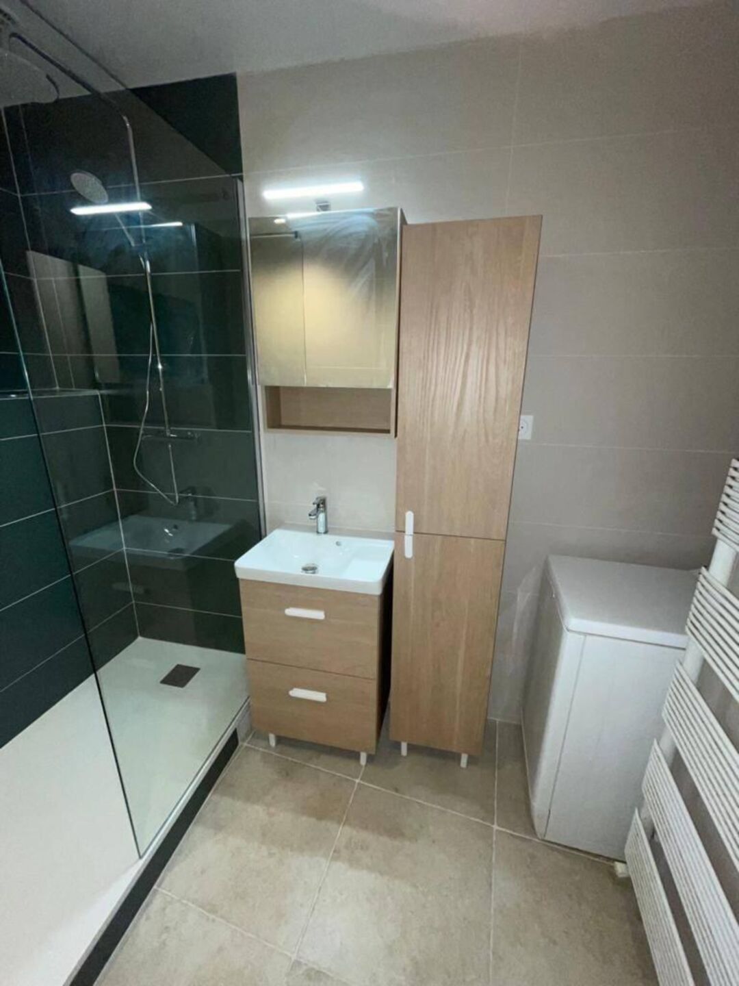 L’agencement a été entièrement repensé afin d’optimiser l’espace disponible. Une douche à l’italienne pratique et esthétique a été installée, accompagnée d’un meuble vasque contemporain, d'une colonne de rangement et d'un sèche-serviettes, offrant à la fois design et confort d’utilisation. Les revêtements muraux et de sol ont été remplacés par un carrelage moderne et résistant à l’humidité, apportant une touche élégante et durable.